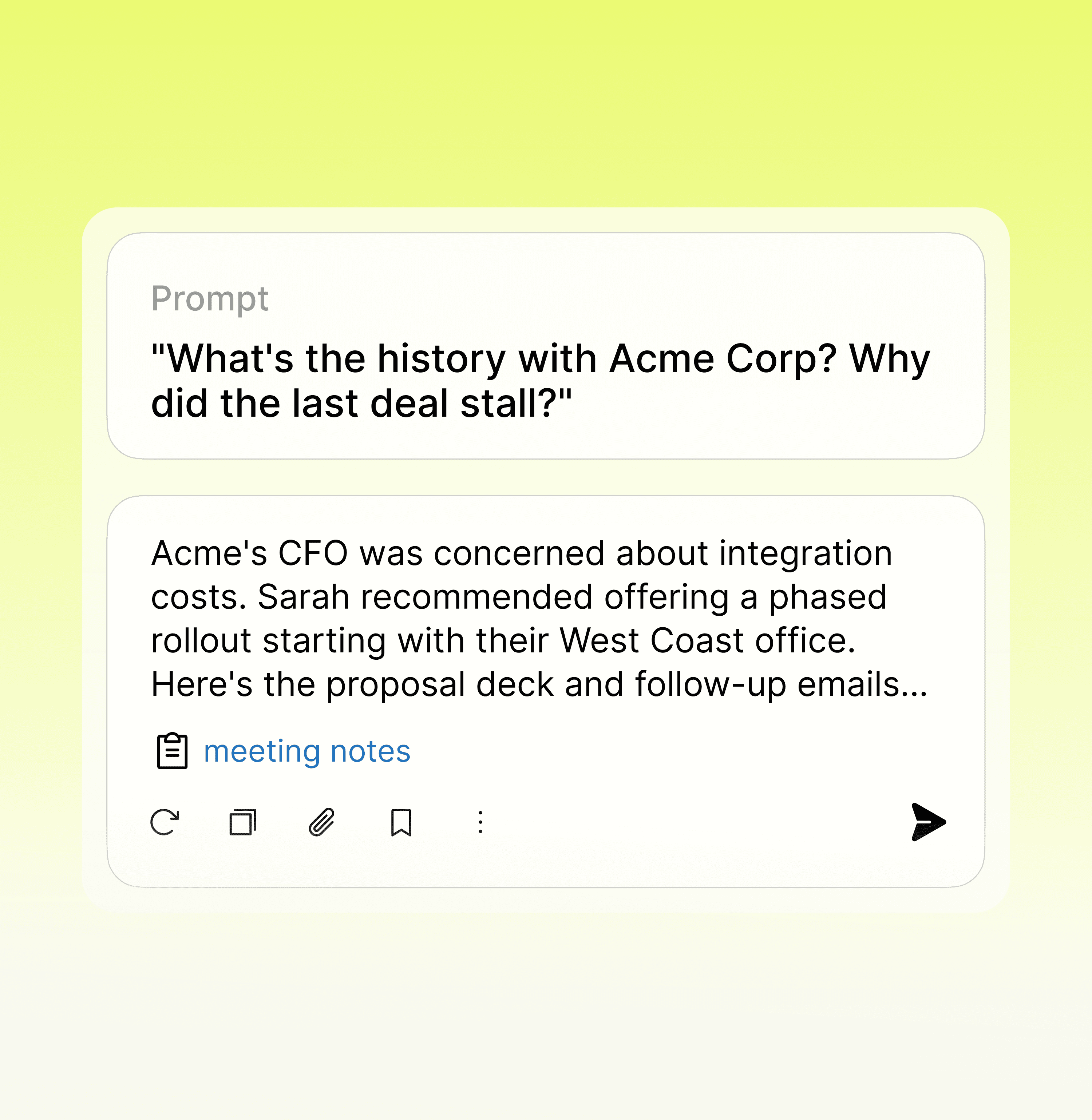New hires shouldn't have to dig through Drive folders. They can ask Relay: "Why did we price it this way?" or "Who is the key contact at Client X?" and get an instant, cited answer from their 'digital predecessor'.